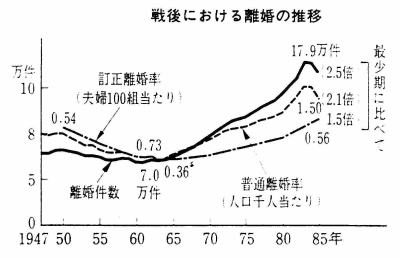 「普通離婚率は1984年から下降している。それは結婚する若年の男女の数が少なくなったためであり、夫婦100組あたりの『訂正離婚率』は依然として上昇している」*24