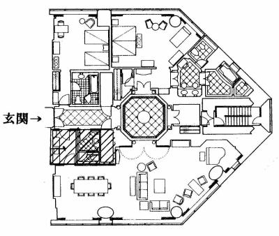 ロイヤルパークホテル日航のロイヤルスィート 玄関下の斜線分を厨房に |
